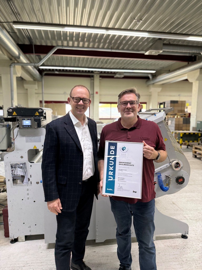 Bei der offiziellen Übergabe der Urkunde durch Heinz Klos, technischer Berater der vdm-beratung, nahm Geschäftsführer Oliver Schmied die Auszeichnung entgegen und betonte: „Der CO2-Rechner ist ein weiterer Schritt, um unsere Umweltverantwortung messbar zu machen und unseren Kunden nachhaltige Drucklösungen anzubieten.“